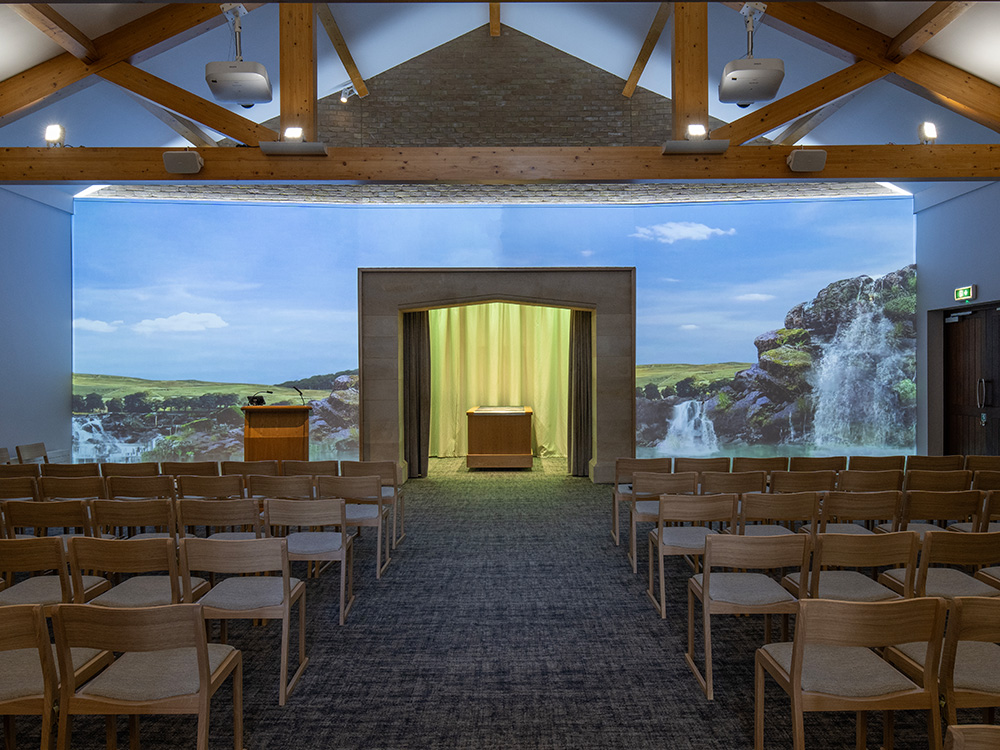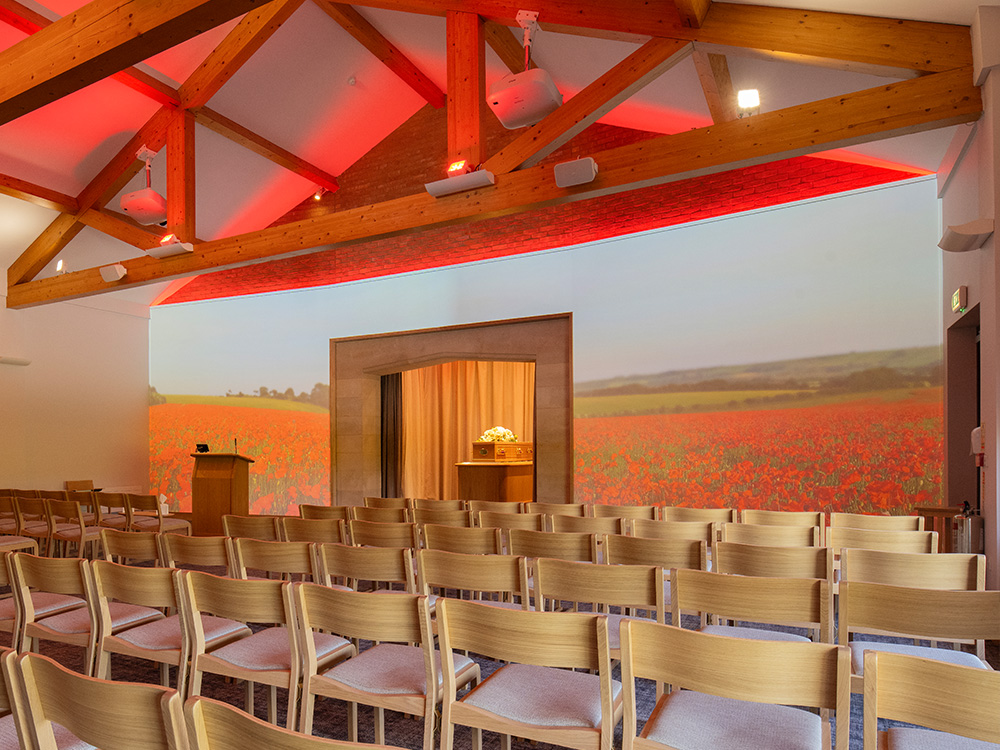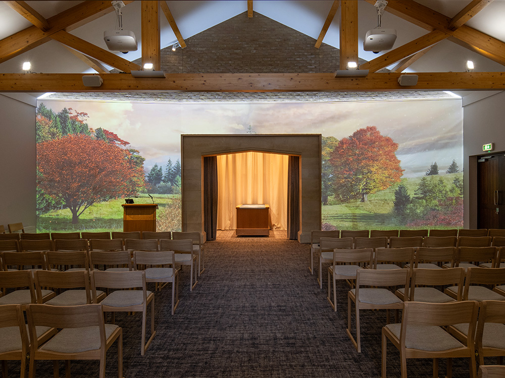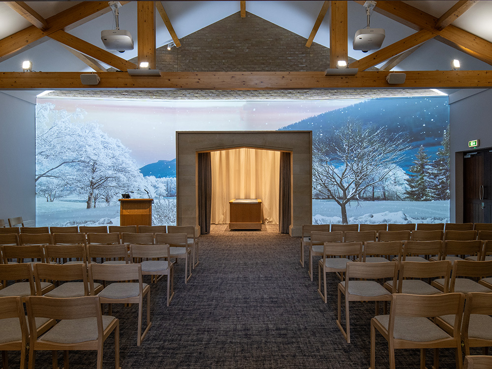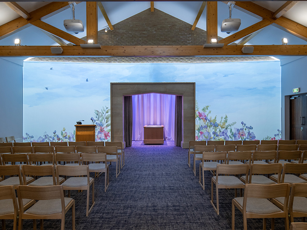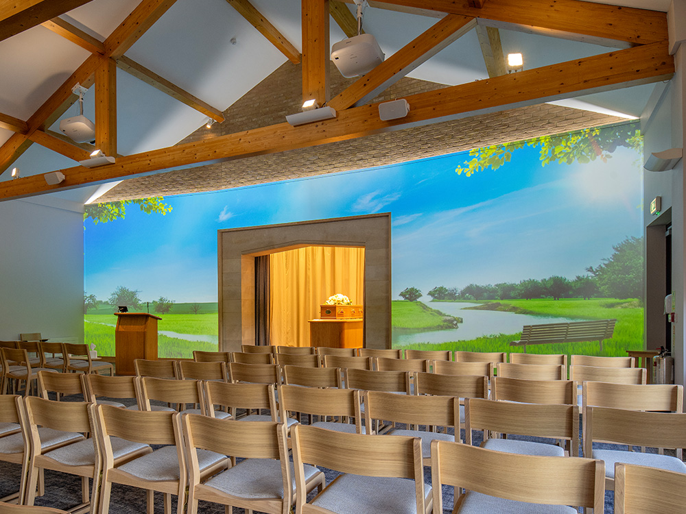 Where other UK venues can only provide visual tributes and photos of a loved one on chapel screens, our canvas wall serves as the entire visual tribute backdrop for a service.