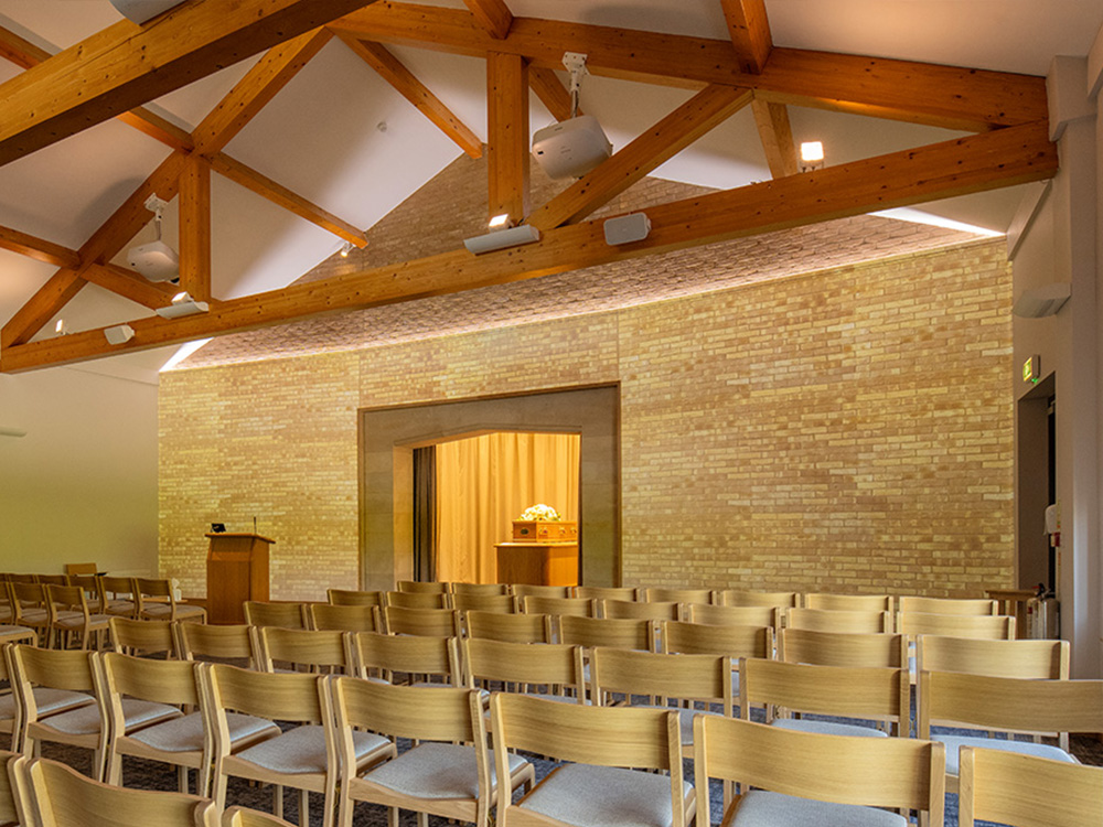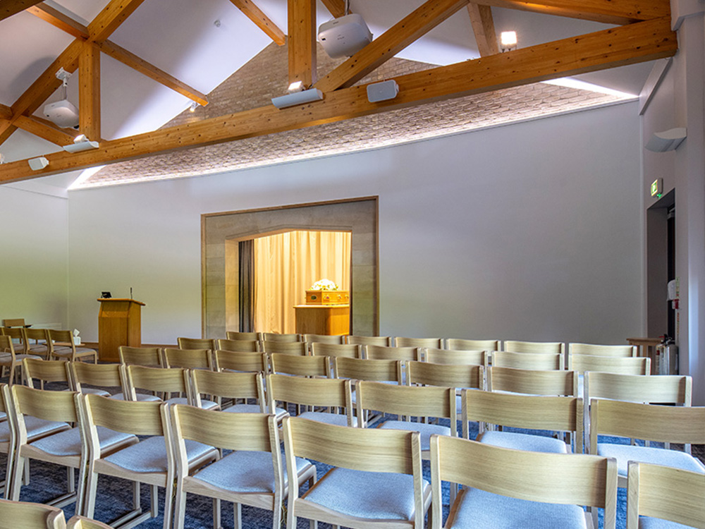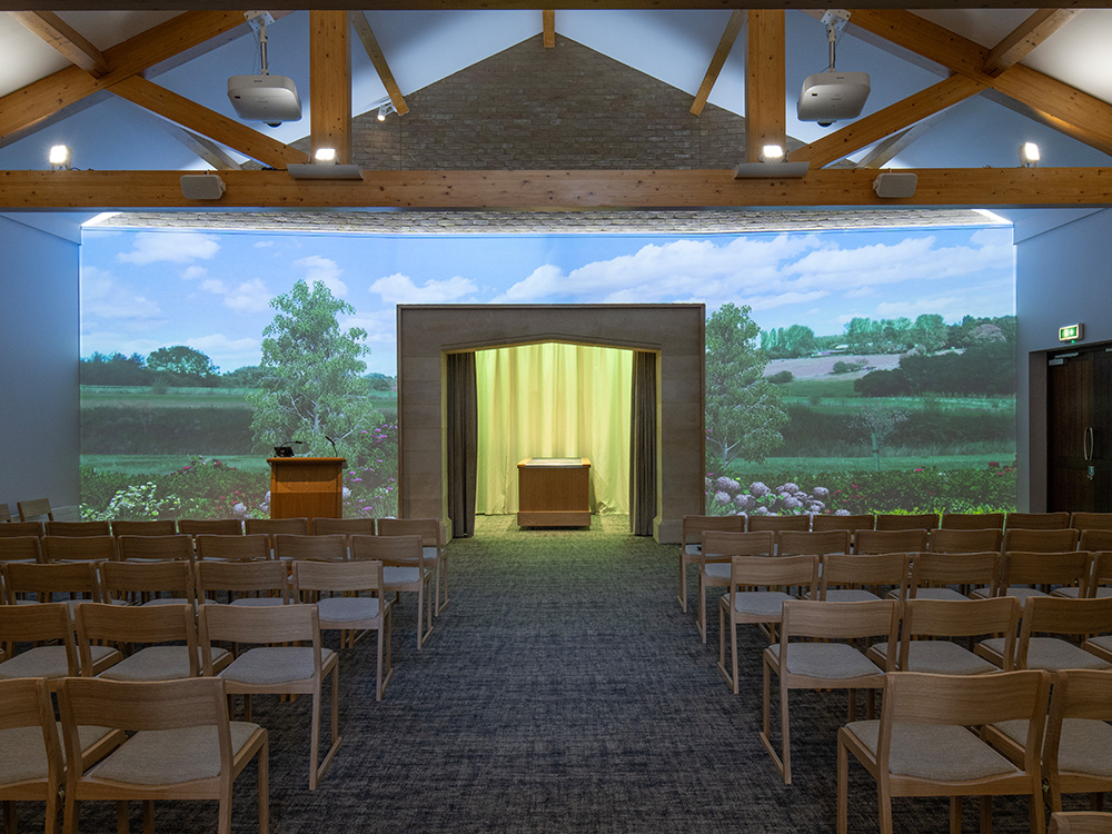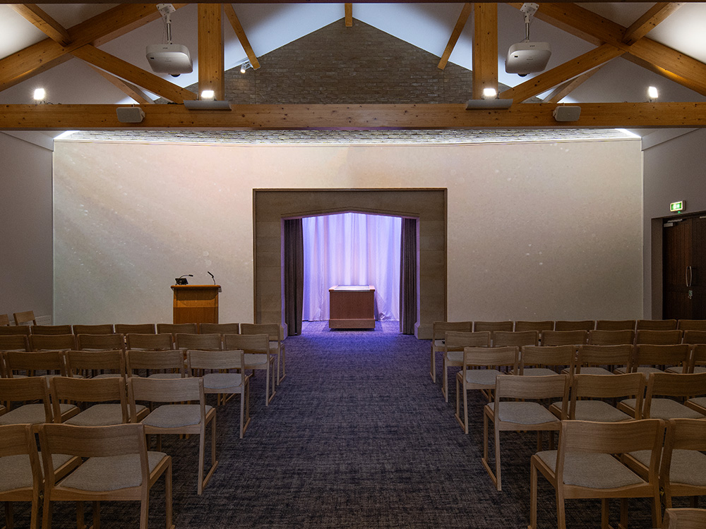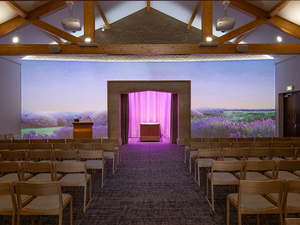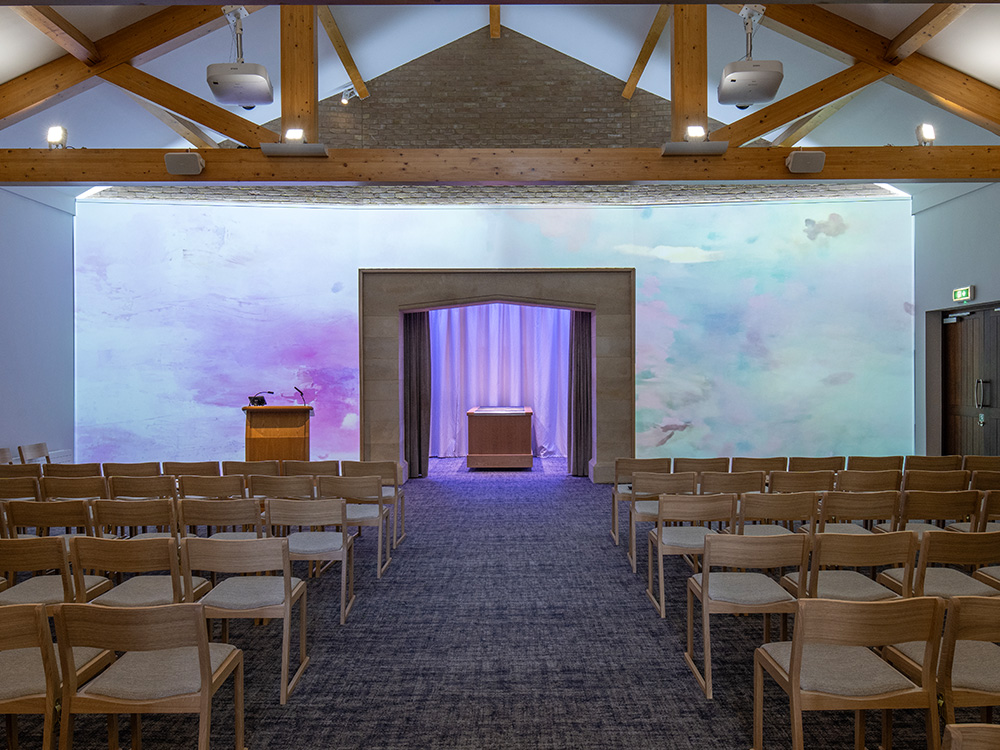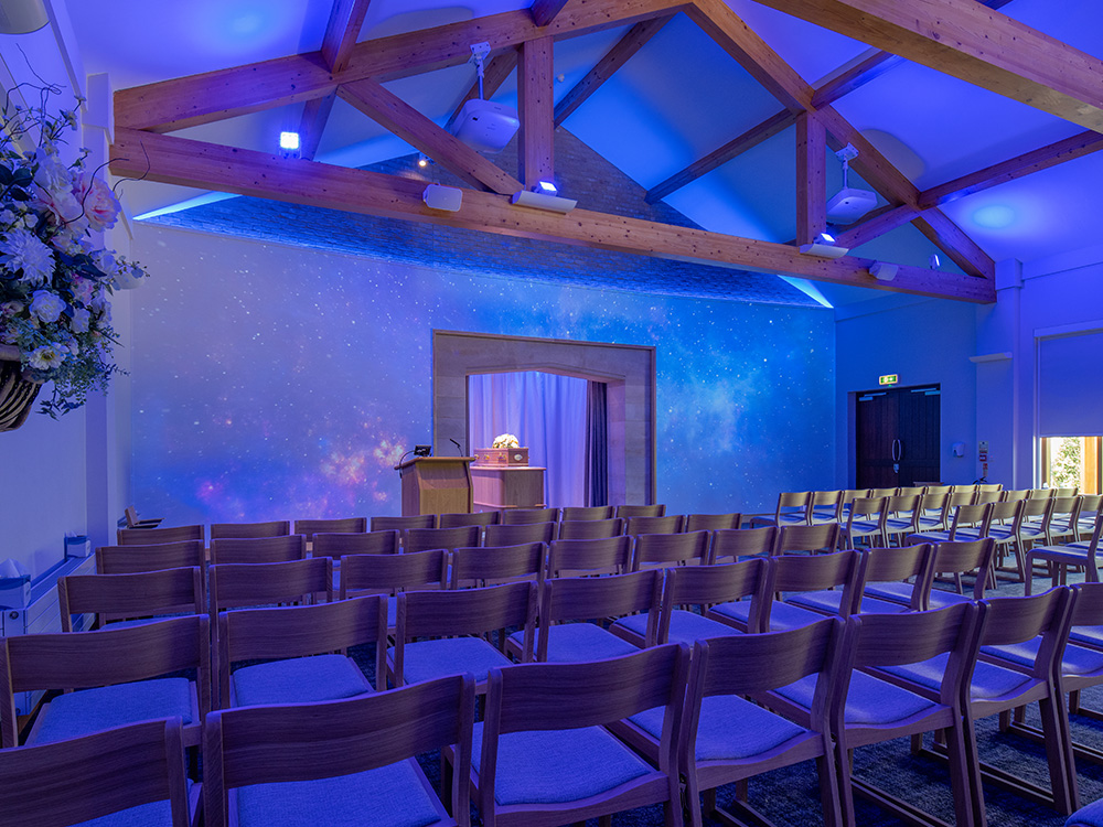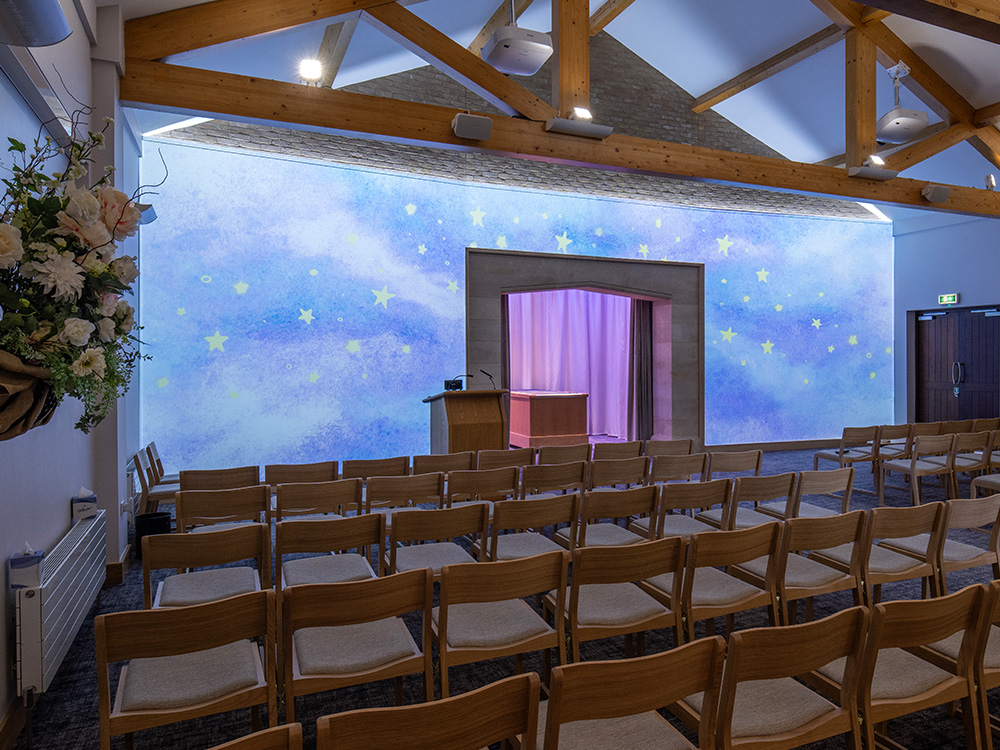 Our state-of-the-art media technology is able to transform the entire wall space around the catafalque into a themed backdrop (Canvas). High-spec audio equipment and customisable lighting enable families to enhance the canvas projections with carefully curated accompanying music and lighting, tailoring the whole chapel to reflect the life of the loved one being remembered.